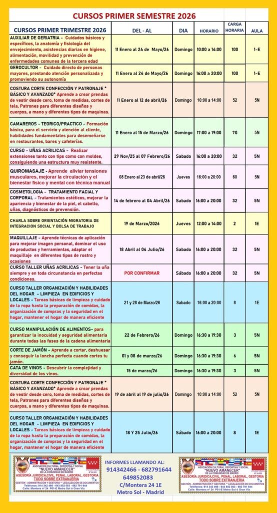A continuación te presentamos el calendario de cursos y talleres programados. Cada actividad está pensada para mejorar tus competencias, brindarte herramientas útiles y facilitar tu integración laboral. Consulta las fechas, días, horarios y duración de cada formación.